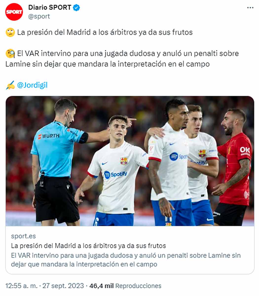 Como el árbitro ACERTÓ acudiendo al VAR para anular el presunto penalti a Yamine que había decretado, Sport concluye que “la presión del Madrid a los árbitros ya da sus frutos”. ¿Acaso alguien en el organigrama del Madrid se ha quejado de algo, incluyendo el latrocinio de Alberola Rojas en el Metropolitano? No, nadie ha dicho nada. Ni Butragueño. Ni Ancelotti. Ni ningún jugador. Nadie.