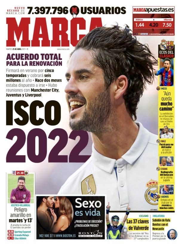 Por último, 'Marca' nos anuncia la renovación de Isco hasta 2022. Se ha dicho que Isco se quería ir, que se iría, que el Barcelona le hacía 'tilín', que Pep Guardiola tentaba al jugador, que la falta de minutos le invitaron a abandonar el Bernabéu. Pero parece que se queda y aquí no ha pasado nada. Será culpa del jugador o algo así. ¿No pensaréis que la culpa la tiene la prensa por especular con informaciones totalmente alejadas de la realidad?