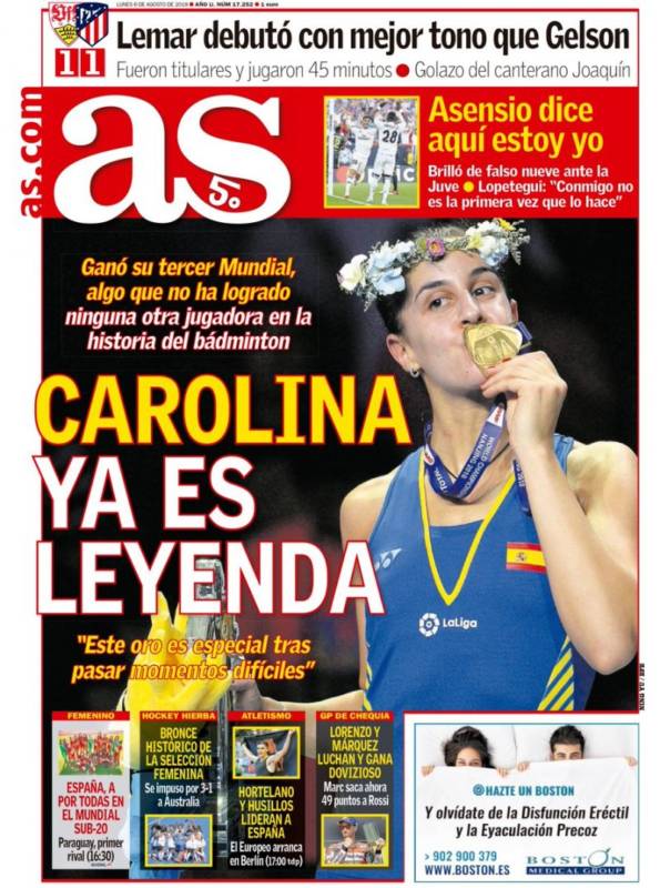 Buenos días. El 'Portanálisis' suele ser una sección crítica, que juzga el doblevarismo de la prensa y busca que el madridismo se dé cuenta del entorno que envuelve al club. Sin embargo, hay días en los que aparece una tregua, casi siempre servida por algo ajeno al propio Real Madrid. Hoy es uno de esos días. Hoy la prensa -salvo 'Sport', que sólo se preocupa del Barça, del Barcelona, del FC Barcelona y del Real Madrid- rinde un merecido homenaje a una leyenda del deporte mundial como es Carolina Marín.