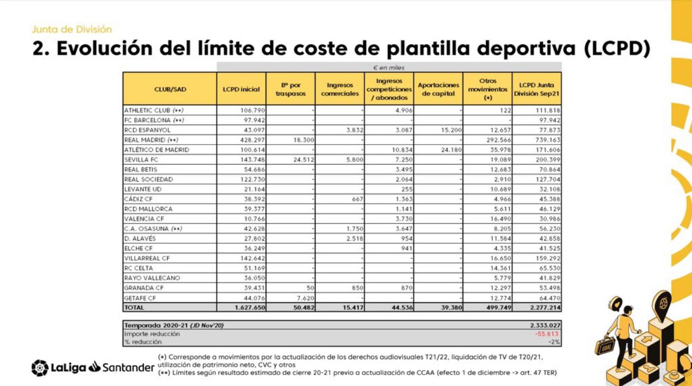 Lo bueno para vosotros, los dirigentes, es que teniendo un cuarto poder tan comatoso no os suelen hacer las preguntas difíciles. Dicen que los youtubers no las hacen, pero los periodistas están más centrados en zarandajas como preguntar con quién comería en un restaurante, si con Rubiales o con Florentino. Cuando dijo que el fútbol español estaba en una buena posición económica, ninguno le preguntó cuánto habrían bajado los límites salariales sin el acuerdo con CVC. Publicaron un retroceso del 2% con respecto a la temporada 20/21 tras mercado de verano, -55 millones, pero es un dato completamente desvirtuado. Primero porque el Real aumentó su límite salarial vía patrimonio neto. Ya sin esto, el límite general podría haber disminuido con respecto a 20/21 en 347 millones.