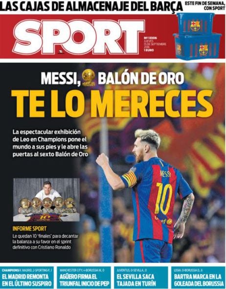 Era un clamor. La campaña estaba en su punto álgido. 'Sport' te agarraba la mano y te ayudaba a cruzar la calle. Se llegó a deslizar, incluso, que sería un escándalo darle el galardón a Cristiano Ronaldo pese a firmar un mejor año. "Los títulos dirán lo que quieran, pero Messi es el número uno". Y punto.