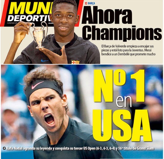PD: No, no nos íbamos a olvidar de las portadas del día en la sección dedicada a ellas. Aprovechamos para felicitar a Don Rafael Nadal Parera, campeón del US Open y madridista hasta los huesos. Eres eterno.
