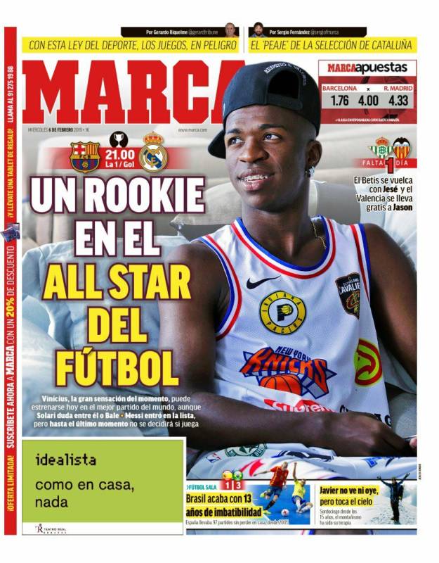 Buenos días, me niego a comentar nada de lo escrito por esa banda de racistas y pequeño burgueses que ES EL Spork, me pasa lo mismo con la importancia que se le da a los partidos contra el club catalán, que para mí ni son nada, ni valen nada, toda la maldita semana dando la " matraca " con el " clásico " de las narices, nos rebajamos innecesariamente, ¿ Cuando tendremos una liga europea para librarnos de la tortura de tener que aguantar estos "tostones"?. Por cierto os pongo mi alienación para hoy. Keylor, Carvajal, Ramos, Varanne, Reguilon, Llorente, Casemiro, Ceballos, de enganche Modriç, Vinicius, Benzema. ¿ Qué os parece?