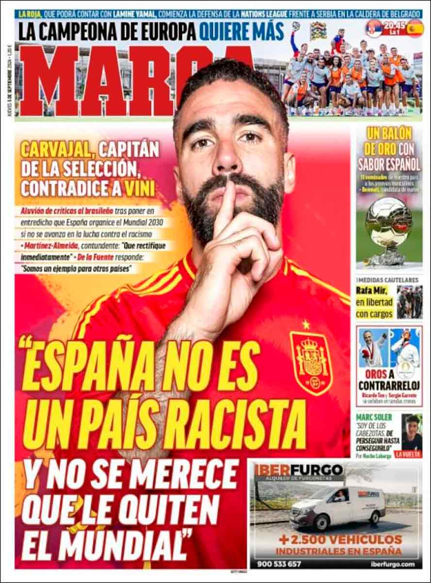 Esto (es decir, que Vinícius jamás dijo que España sea un país racista) es algo que sabe de sobra Marca, que sin embargo se permite la absurdez malintencionada de escoger para su portada una foto de Carvajal mandando callar (supuestamente a Vini). No es lo más grave, porque además de hacer eso Marca miente.