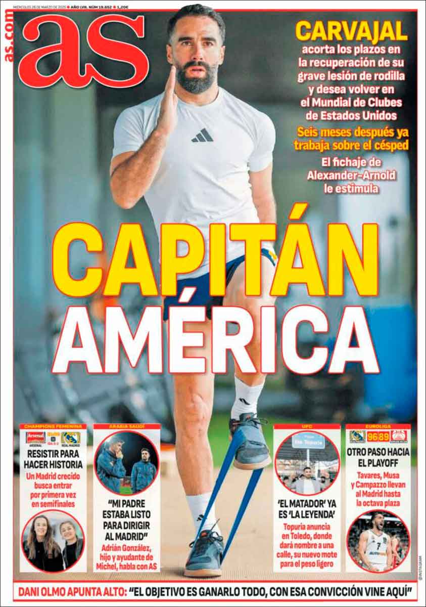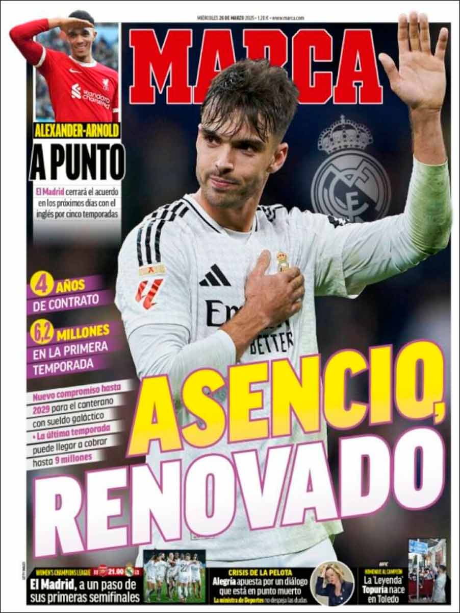 Hablando de pilas, el Madrid se ha puesto las AAA. AAA no es la Asociación Atlética Avilesina, ni la Asociación Andaluza de Archiveros, ni siquiera la Asociación Acuariófila Argentina, sino el binomio formado por Asencio y Alexander-Arnold, quienes junto a Carvajal protagonizan las portadas de los dos diarios madrileños.