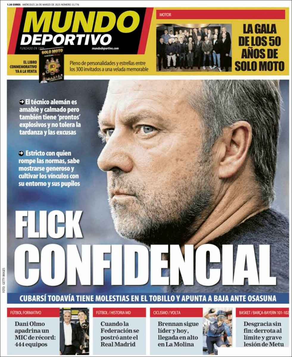 Mundo deportivo ha elegido al técnico del Barça para ilustrar su tapa y destaca características tan confidenciales de Flick como que «es amable y calmado, pero también tiene sus “prontos” explosivos y no tolera la tardanza y las excusas» o que es «estricto con quien rompe las normas, sabe mostrarse generoso y cultivar los vínculos con su entorno y sus pupilos». Asombroso, ¿verdad?, no existe nadie en el mundo con esas características tan particulares y tan poco generales.
