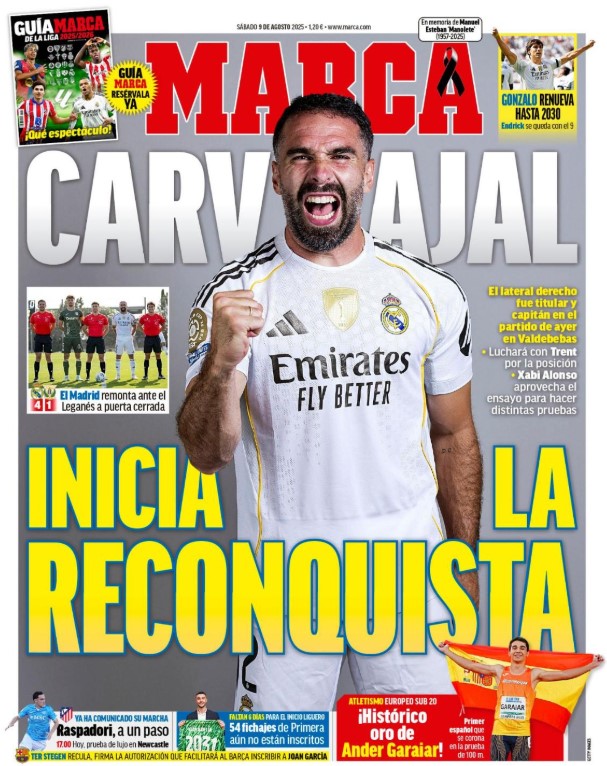 Y nos encanta ver a Carvajal así: “dientes, dientes, que es lo que les hode”, como decía aquella folklórica. El leganense siempre fue uno de los termómetros anímicos del equipo, el que ponía la tensión cuando el equipo se despistaba. Su ausencia toda la temporada pasada fue clave para la apatía que el equipo mostró en buena parte de los partidos, y su retorno, su “reconquista”, es una gran noticia, aunque suponemos que para Marca será un problema, pues, como indican, “luchará con Trent por la posición”. Carvajal o Trent, Gonzalo o Endrick, que se quedará con el 9, Vinícius o Mbappé, o quién sabe cuál será la próxima polémica artificial: Mastantuono o Güler, Rodrygo o Brahim, pizza con piña o tortilla sin cebolla.
