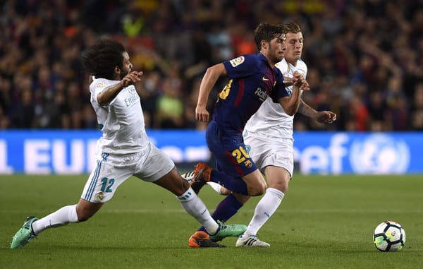 Una opción que tiene el equipo de Zidane es negar la profundidad por su lado desactivando la conducción de un Sergi Roberto que llega en estado de gracia y está generando tanto llevando la jugada como soltándola -sobre todo si recibe en movimiento-, y anulando el punto de encuentro del juego interior con Leo, buscando obligarle a abrirse hasta la cal para intervenir o pedirla delante de la media blanca. Al mismo tiempo, resultaría un negocio potencialmente rentable motivar el aumento de la presencia de Rakitic, que presumiblemente jugará detrás de la línea de balón, en la gestión de las posesiones que caigan a su perfil. Su lentitud gestual en la secuencia control de balón-más-pase, y ausencia de agilidad mental y creatividad diferencial, puede reducir el ritmo de juego culé contribuyendo así al objetivo de que la jugada le llegue apagada a Messi y a que el Madrid se mantenga defendiendo mirando a portería rival y no a la propia, disminuyendo la complejidad de la defensa y posibilidades de que el conjunto culé gane metros por su lado fuerte.