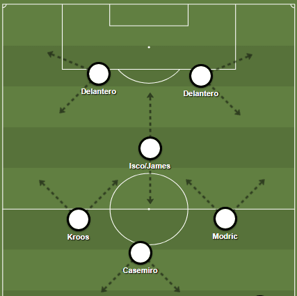 4-3-1-2 con gol desde la media: Si cambiamos a uno o dos de la CKM + Isco por centrocampistas con más llegada y gol, seguiría faltando movilidad y verticalidad de la delantera. Pogba, Eriksen o algún otro centrocampista sumaría llegada, disparo y gol, pero no la movilidad o el regate que necesita dicho sistema.