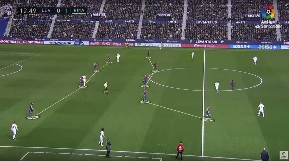 Con respecto a la transición defensiva, donde Casemiro ha sido absolutamente clave en los últimos años, mostrándose como un auténtico coloso, también ha empeorado considerablemente, y de ella no ha escapado ninguno de los tres protagonistas. Kroos pareció ir siempre andando, quedando lejísimos del balón en todo momento, Casemiro no ha sido en ningún momento un sostén para el equipo y a Modric le han fallado tanto las fuerzas como el equipo. Así, el nivel individual de cada uno ha sido bajo, pero también influenciado por un equipo muy vertical que perdía la pelota muy rápido y con el equipo muy separado, no pudiendo acompañar la jugada casi nunca, solo cuando, de inicio, Solari plantaba a sus hombres arriba para apretar la salida rival.