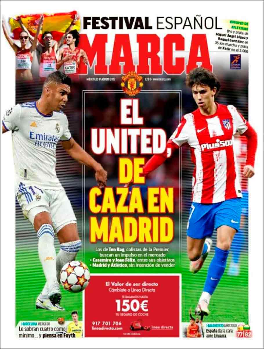 Buenos días. Vamos a ver. Es simplesh, que diría José Mourinho. Parece ser que podría llegar una oferta del Manchester United por Casemiro. El histórico club inglés está en bajísimas horas deportivas, y anda sacudiendo el mercado en busca de remedios que le permitan reverdecer laurales o, al menos, poder entrar en el territorio de la Champions, abandonando el sucedáneo casi humillante de la Europa League. Por eso anda de caza en Madrid, como literalmente titula Marca con el correspondiente artículo de José Félix Díaz. La caza, se nos indica, incide potencialmente tanto en Casemiro como en Joao Félix Díaz (perdón, quiten el Díaz, nos hemos encasquillado con la frase anterior), aunque en una publicación desacomplejadamente madridista como este solo nos atañe lo relativo al legendario medio centro del Real Madrid, no así al excelente delantero portugués del Atleti.