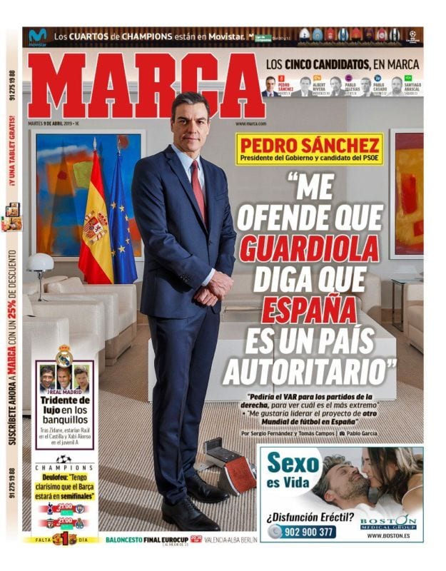 Marca viene en cambio con una portada potente. El diario dirigido por Gallardo entrevista en los próximos días a los cinco principales candidatos en las próximas elecciones generales, y empieza por el actual Presidente del Gobierno Pedro Sánchez. Sánchez se declara ofendido cada vez que Guardiola califica a España de “estado autoritario”. Hay que felicitar a Marca por obtener estas declaraciones del Presidente porque son relevantes y certeras, si bien habría cabido repreguntar al Presidente del Gobierno de España si no se siente también ofendido cuando se juegan 90 minutos completos en el Camp Nou bajo pancartas que transmiten mensajes idénticos a los que proyecta Guardiola, y si no sería posible hacer algo por evitarlo. Por su parte, este modesto portanalista tiene en su habitación un póster con la cara de Mauricio Pochettino y la leyenda “Haz que pase”.