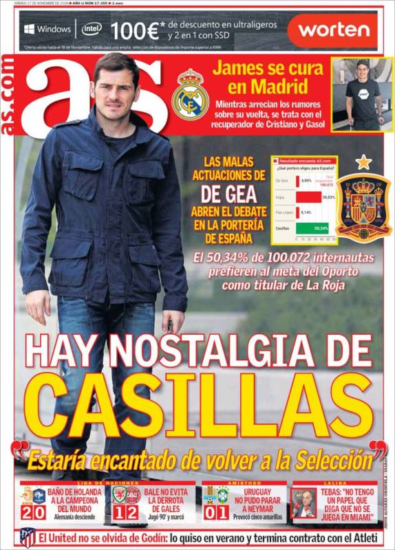 Yo mientras los madridistas no tengamos nostalgia por Casillas en el Madrid que tengan los demás toda la que quieran de él en la selección....como si lo quieren recuperar....tanto me da....de todos modos para la canalla periodística patria tanto Casillas como Kepa son dos errores del Madrid jaajajajaja....uno al que se trató y empujó a la salida injustamente y el otro al que se despreció por un precio módico jajajajajaja....es un no parar de hacer las cosas mal jajajaajaj....el único que ya no puede ser usado contra nosotros, al menos en estos día, es el pobre De Gea que nos está haciendo adorar a un fax 😉