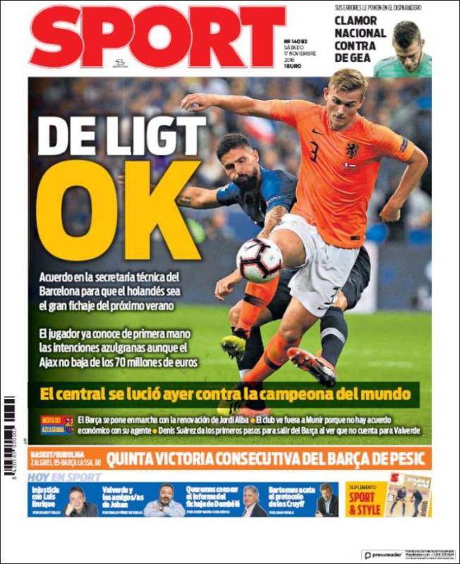 La prensa cataculé, aka Sportivo, está a sus cosas, sus fichajitos y tal, sin que ello les impida participar en la caza de brujas contra De Gea. "Clamor nacional contra De Gea", clama a su vez Sport, que a veces es muy de España, de España desde shequetito. Sólo una pregunta para esa redacción cuajada de muy respetables indepes: ¿clamor nacional o clamor estatal? A ver si la vamos a liar.