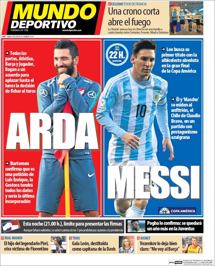 Sin embargo, Sport Deportivo (o Mundo Sport) sale ufano a los kioskos, sin medias tintas ni turbiedades, todo parabienes, sonrisas y autopalmadas en la espalda. Parecen no preocuparse ambos medios de que sus portadas sean siempre la misma, porque acaso lo decisivo sea justamente la repetición de la fiesta de siempre. Lo dicho: mientras Marca y As hacen constante acopio de arena para el castillo, la prensa catalana se entretiene cantando la misma canción frente a la hoguera. Eso sí, agradecemos que ya no sea Pogba el invitado de honor, ni el cantante principal, aunque solo sea porque -según dice Mundo Deportivo- el jugador confirma que "se quedará un año más en la Juventus". ¿Y para esto tanta desazón, amics? ¿Tantos días de portadas con Paul para que ya tengamos pesadillas con las portadas del verano siguiente? ¿Tanto humo, tanta arena? En fin.
