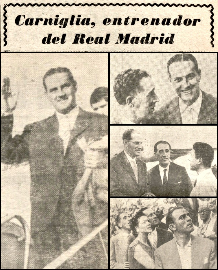 El técnico recordaba así aquellos momentos en una entrevista en El Gráfico: “Una tarde recibo una llamada telefónica desde Madrid. Era Raimundo Saporta, la mano derecha de Santiago Bernabéu: “Escuche, Carniglia, me dijo, ¿qué prefiere, hablar francés o español?” No lo podía creer. Días después fue Alfredo di Stéfano el que llamó: “Vente para acá que te quieren mucho”. Carniglia no fue a Madrid, sino que Saporta viajó a Niza. Allí se reunieron en el hotel Negresco y “una botella de champagne fue suficiente para sellar el acuerdo”. El Real le compró una casa, la amuebló y a partir de agosto de 1957 se puso a trabajar para el club blanco con un contrato de dos temporadas.