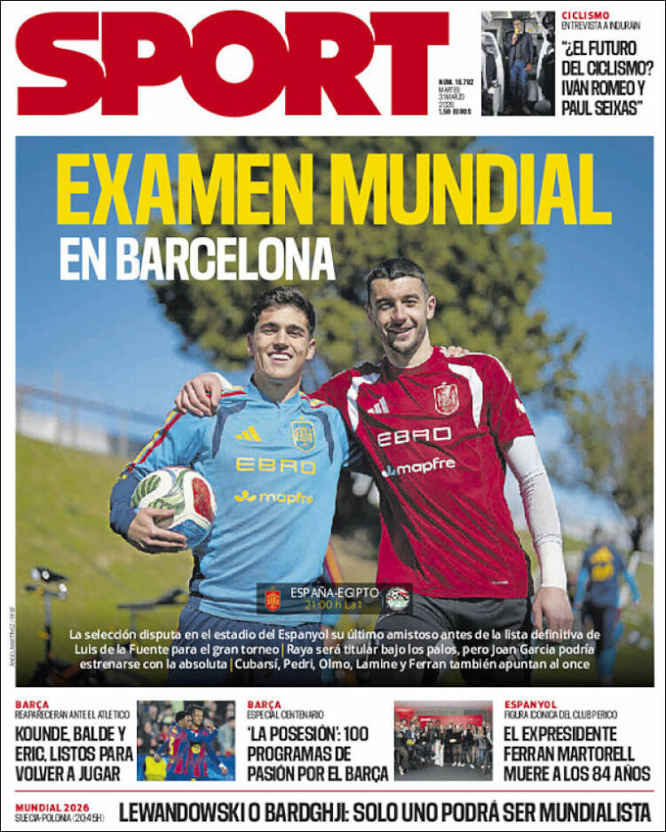 La prensa cataculé se centra en el debut de Joan García. Luis de la Fuente ya le hizo el favor al Barça de aplazar su convocatoria para esquilmarle 5 millones al Espanyol. Ayer decidió hacerlo debutar en su antiguo estadio con el inevitable escarnio sufrido por su anterior afición. Cuando se le preguntaron los motivos, no contestó. No esperábamos otra cosa de alguien que se dejó las manos aplaudiendo a Rubiales.