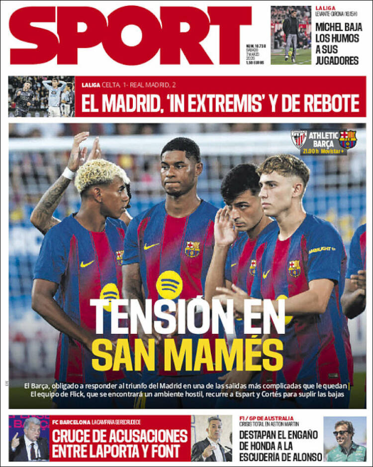 Sport refleja la complicada tesitura en la cual la victoria vikinga en tierras gallegas sitúa a los clientes de Negreira, obligados a vencer hoy al Athletic Club si quieren sostener la renta de cuatro puntos sobre el Madrid. A la hora de sintetizar lo acontecido en Balaídos, el eximio rotativo cataculé no tiene reparo en explicitar su rabia. "El Madrid, in extremis y de rebote". Parece que, por lo que sea, no les ha sentado demasiado bien la trabajada victoria del rival. "El Madrid, in extremis, de rebote y con demasiados jugadores con el pelo rizado" habría sido, a nuestro juicio, una forma más explícita de hacer constar la bilis desatada en la redacción del ilustre medio barcelonés.