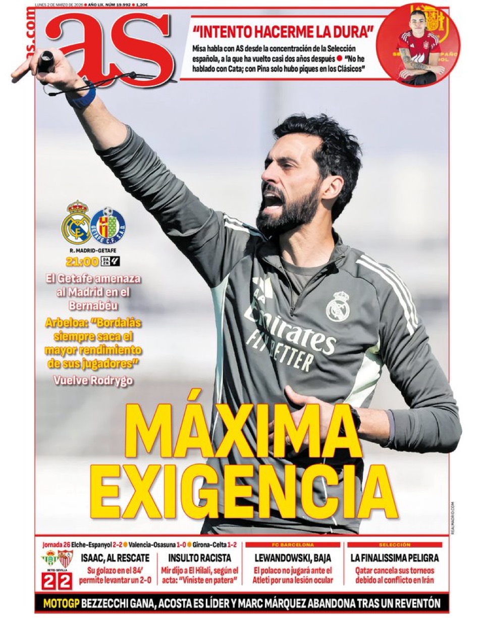 Por lo demás, As y Marca se centran en el partido que esta noche disputarán Madrid y Getafe en el Bernabéu, con la espada de Damocles de los puntos encima de las cabezas de los de Arbeloa y la posibilidad razonable de una joven incorporación al once: Thiago Pitarch. Ya debutó, y con buen pie, el púber centrocampista del Castilla, en quien tenemos depositadas muchas esperanzas. Parece ser que Camavinga tiene un problema dental, lo que le abre la puerta. No deja de tener su gracia que Camavinga tenga que ir al dentista en el mismo día en que recibimos al Getafe, que es la metafórica visita al dentista marcada de antemano en el calendario.