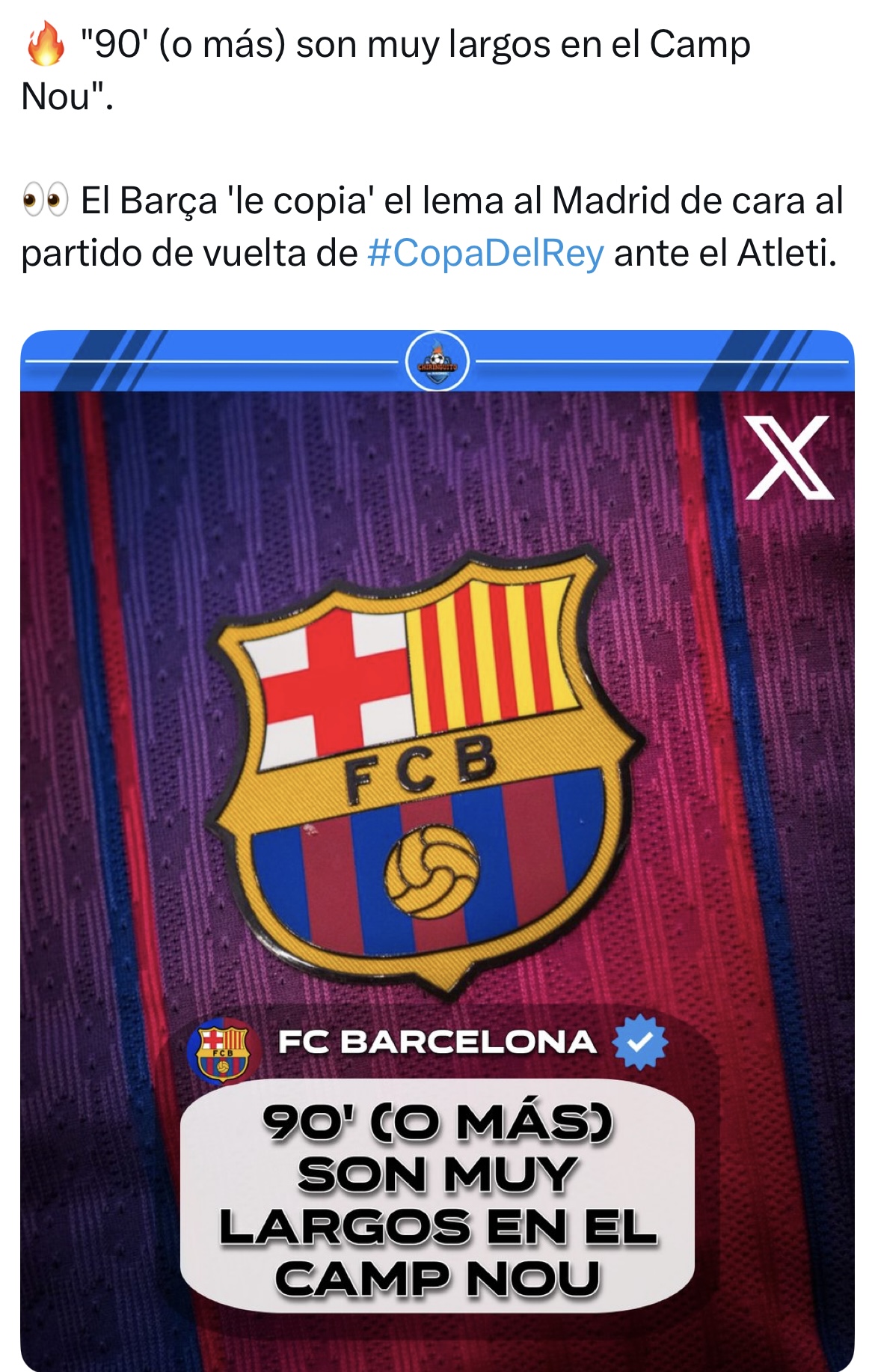 Para rematar la falta de verdadera enjundia remontadora del club cliente de Negreira, los muy desvergonzados han trincado el viejo lema juanitista de las remontadas blancas (“90 minuti en el Bernabéu son molto longo”), lo han tuneado y han coronado el desacomplejado plagio poniéndolo en sus redes sociales.