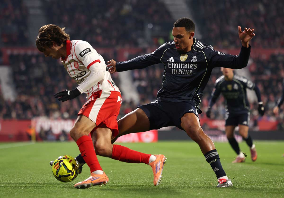 Curiosamente, las jugadas más peligrosas, sin embargo, cayeron del lado local, con disparos inquietantes de Tsygankov y Ounahi que hacían presagiar la entrada en modo pájara de los visitantes. No fue del todo así y el Madrid recuperó la posesión, si bien en la misma tónica general de no crear apenas peligro, como con frecuencia les pasa ante los bloques bajos. El Girona competía bien, y los de Xabi solo amenazaban a través de pases largos de Trent.