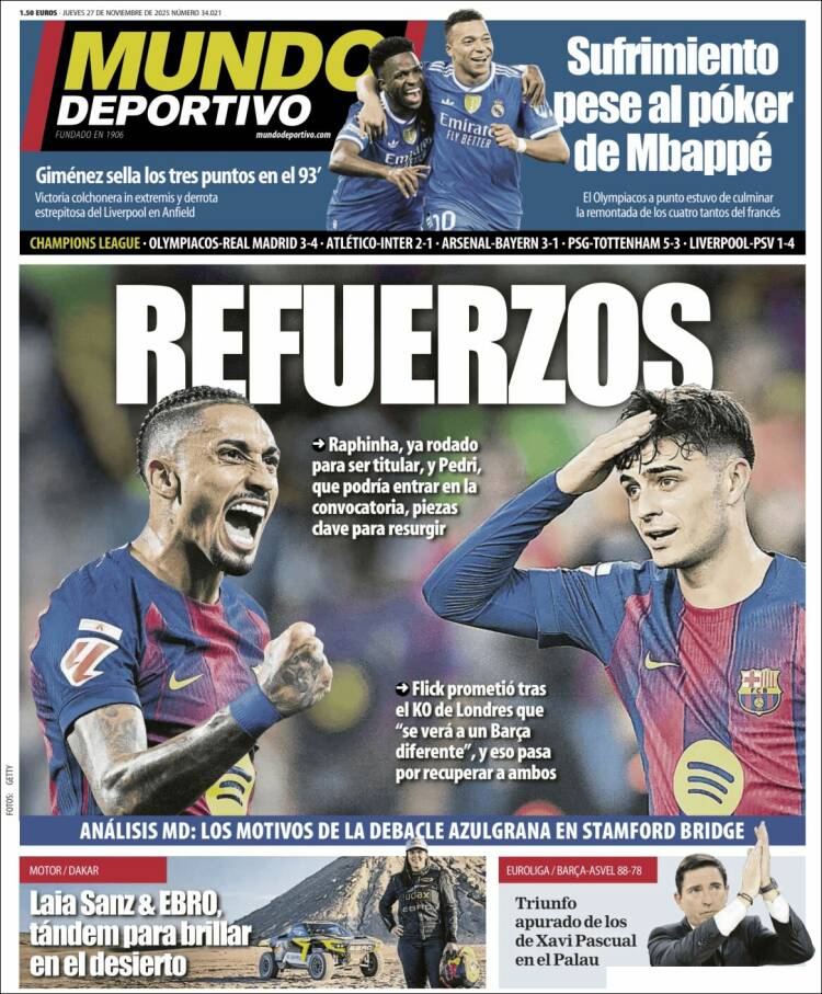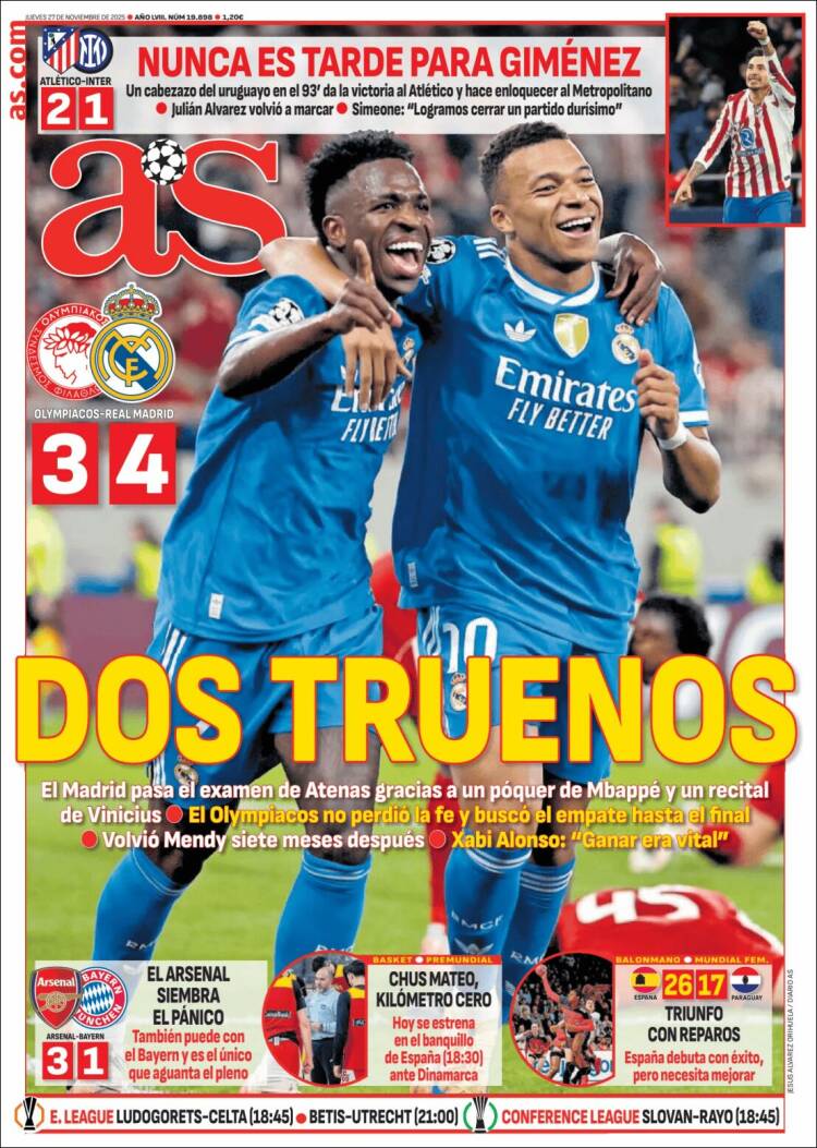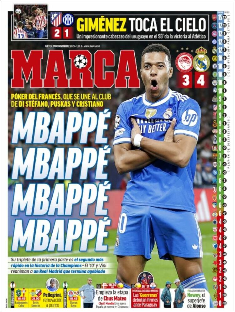 En Grecia, el Real Madrid ganó por primera vez en su historia -ya queda menos por conquistar en este mundo que se nos queda pequeño- al Olympiakos de Mendilibar por 3-4. Lo hizo gracias a Mbappé, que se apuntó los cuatro tantos en una actuación de mando soberano, casi obsceno. Dijo luego el francés que no hay dependencia de sus goles, y que sin embargo la prensa debería criticarle a él por no marcar ni en Vallecas ni en Elche, y le faltó quitarse la montera y saludar al tendido después. También fue gracias a un gran Vinícius Jr. que, por momentos, y gracias a la abundancia de espacios y de metros para correr, se pareció a ese que añoramos y que sí se merece cobrar 30 kilos.