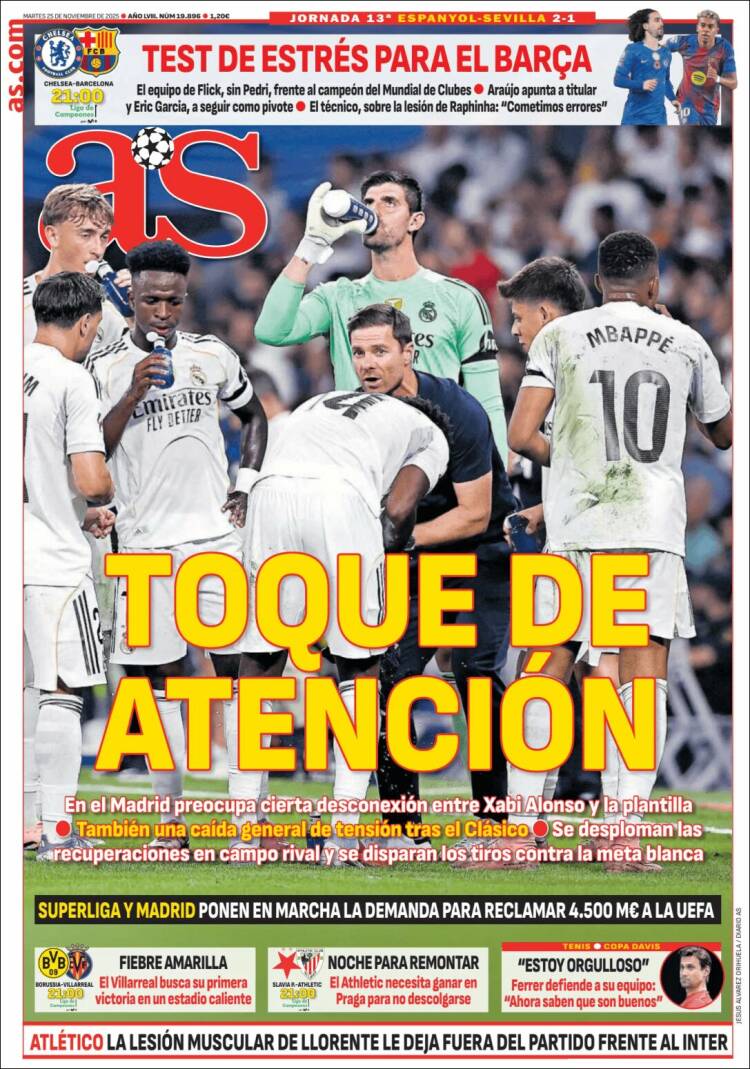 As lo resume en «Toque de atención», seguido de «En el Madrid preocupa cierta desconexión entre Xabi Alonso y la plantilla. También una caída general de tensión tras el Clásico. Se desploman las recuperaciones en campo rival y se disparan los tiros contra la meta blanca». Hoy no podemos poner un pero: es la realidad.