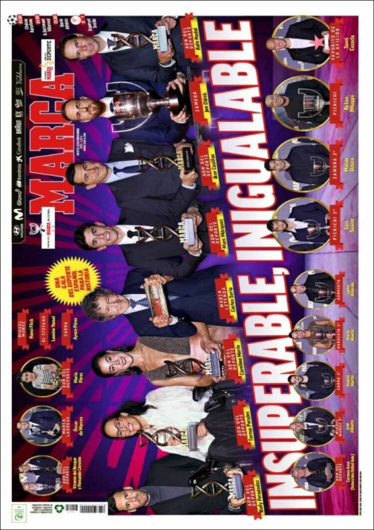 Y los tiempos changin’ tan raudos que aparecen portadas giradas 90º, como la de Marca.