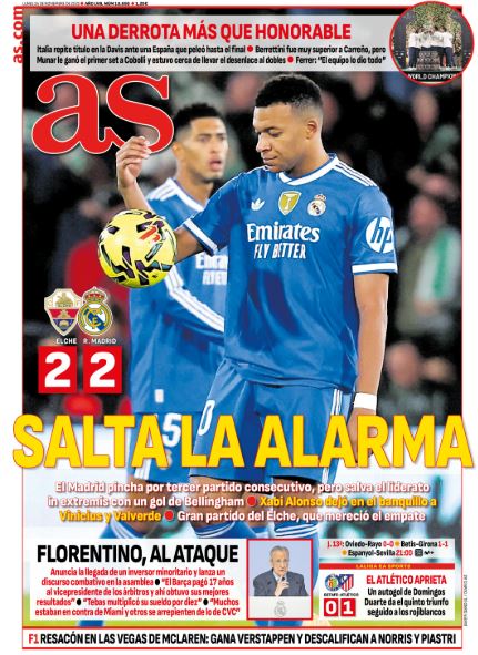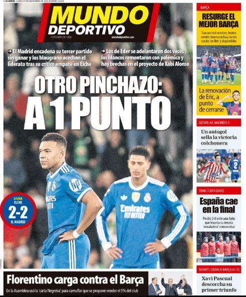 As lo resume en «Toque de atención», seguido de «En el Madrid preocupa cierta desconexión entre Xabi Alonso y la plantilla. También una caída general de tensión tras el Clásico. Se desploman las recuperaciones en campo rival y se disparan los tiros contra la meta blanca». Hoy no podemos poner un pero: es la realidad.