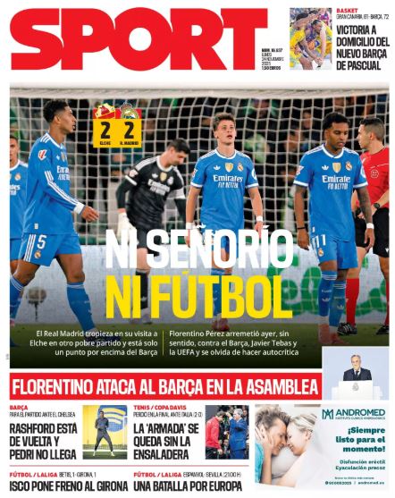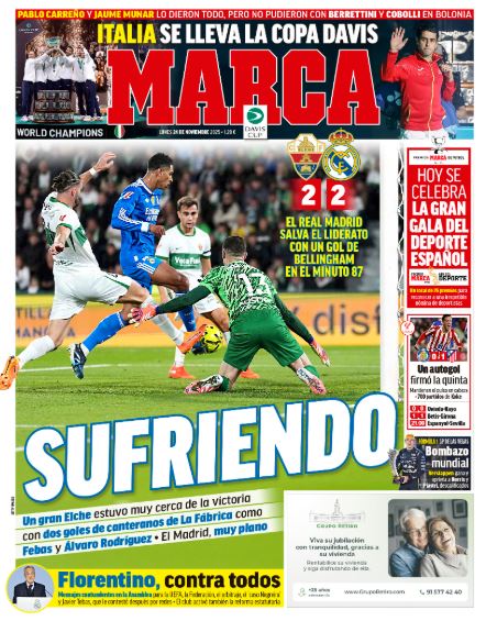 Podéis valorar la supuesta polémica tras leer la opinión de Alberto Cosín, siempre preciso y objetivo en su análisis del arbitraje. Las portadas de los diarios As y Marca destacan el sufrimiento de los blancos y la caída mostrada en el juego:
