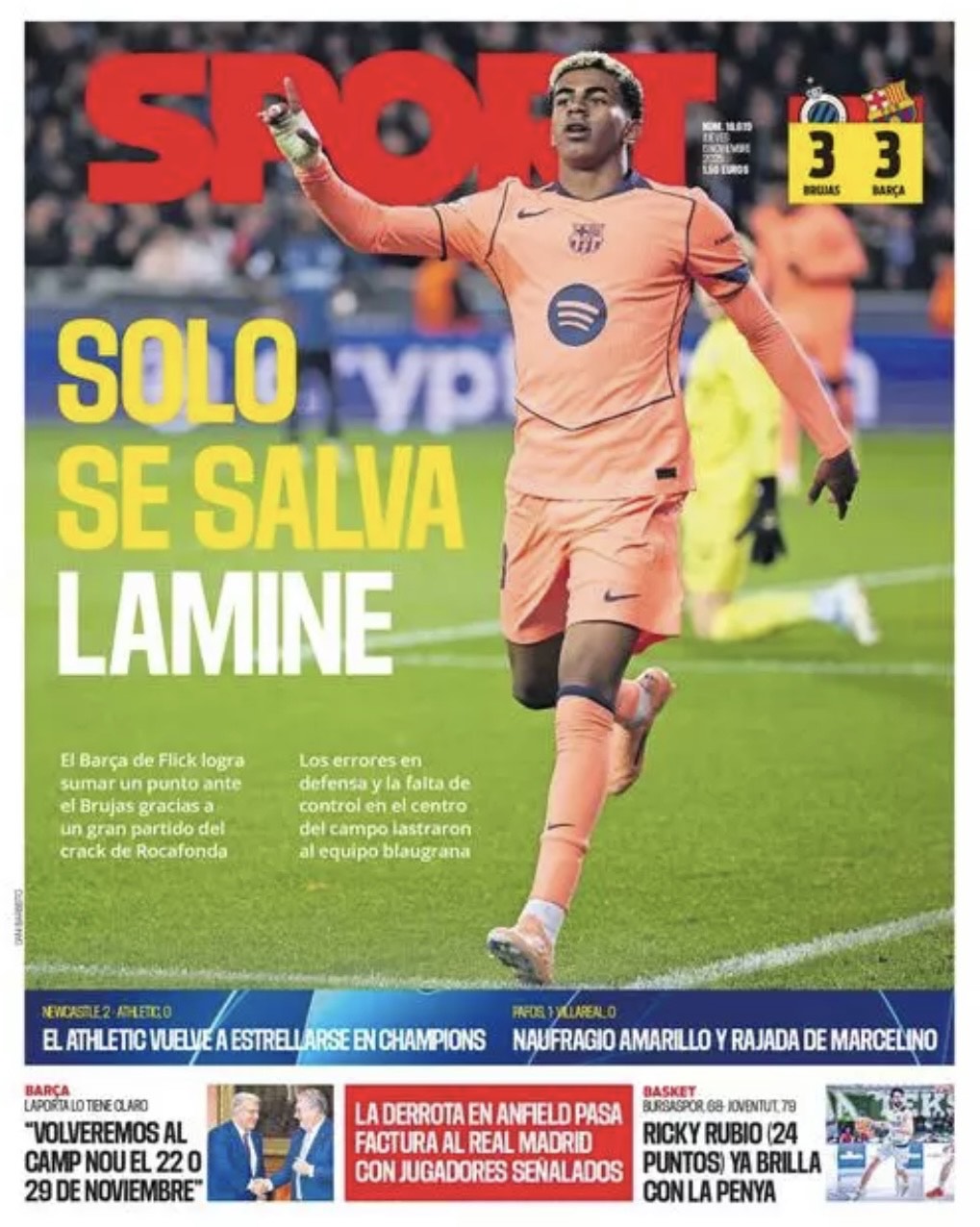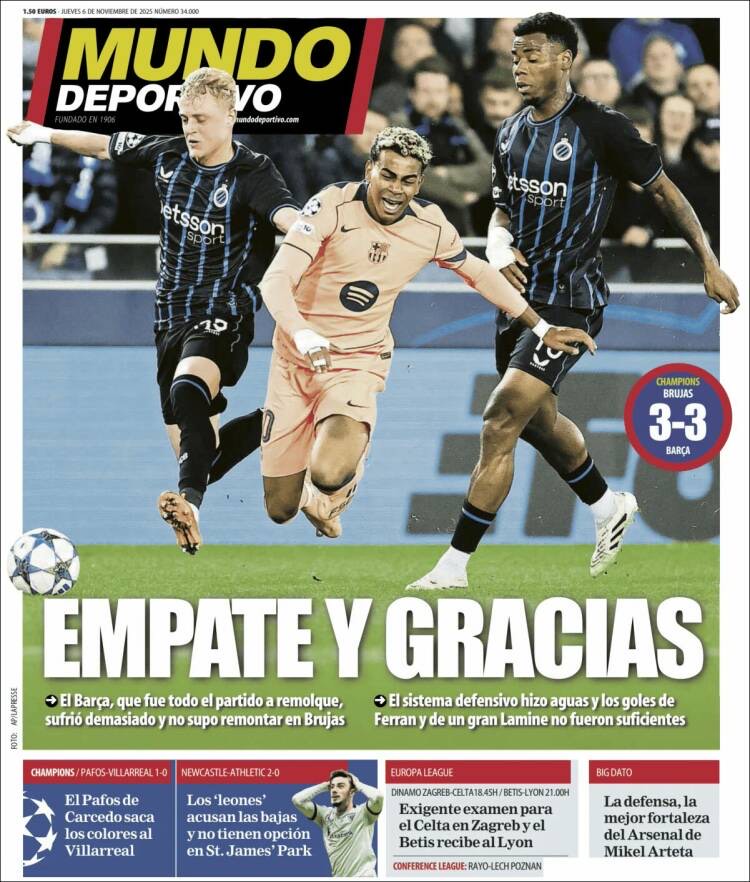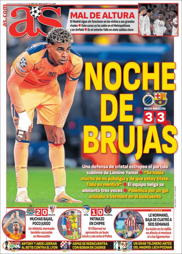 Marca, cada día más conocida como Marça por el pueblo soberano, que suele tener argumentos de peso para decir las cosas que dice e inventar los sobrenombres que inventa, se rinde también a los pies de Lamine, que para eso el diario dirigido por Gallardo es el máximo representante de la Central Lechera (?) en la piel de toro. “El brujo es Lamine”, titulan, en agudísimo juego de palabras con el nombre de la ciudad donde se obró el atraco. Marca sí menciona el gol anulado a los locales, pero tilda la jugada de “acción al límite” de Szczesny. Suponemos que se refieren al límite entre el teatro amateur y profesional sobre el que tanto escribieron Nicholson, Holdsworrh y Milling.