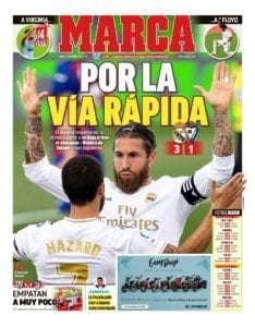En las esquinas superiores, Marca hace pertinente alusión al aspecto solidario en la celebración de algunos de estos goles en esta nueva y marciana etapa: Costa anotó para el Atleti en su partido contra los bilbaínos y mostró la camiseta de la jugadora del Atleti Virginia Torrecilla, a quien deseamos una pronta recuperación. Marcelo, por su parte, hincó rodilla en tierra en ademán #BlackLivesMatter, algo a lo que As otorga carácter preferente en su primera plana.