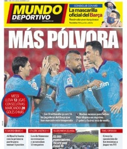 Precisamente, en la portada de Mundo Deportivo, vemos a Busquets celebrando con sus compañeros el primer gol del Barça frente al Mallorca, todo ello bajo el anuncio también solidario de las mascarillas oficiales del Barça, ya a la venta para sortear sin sustos estos tiempos de pandemia.