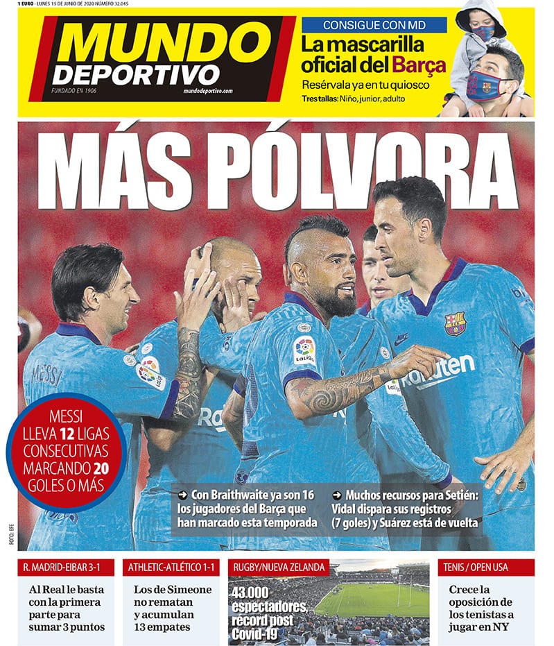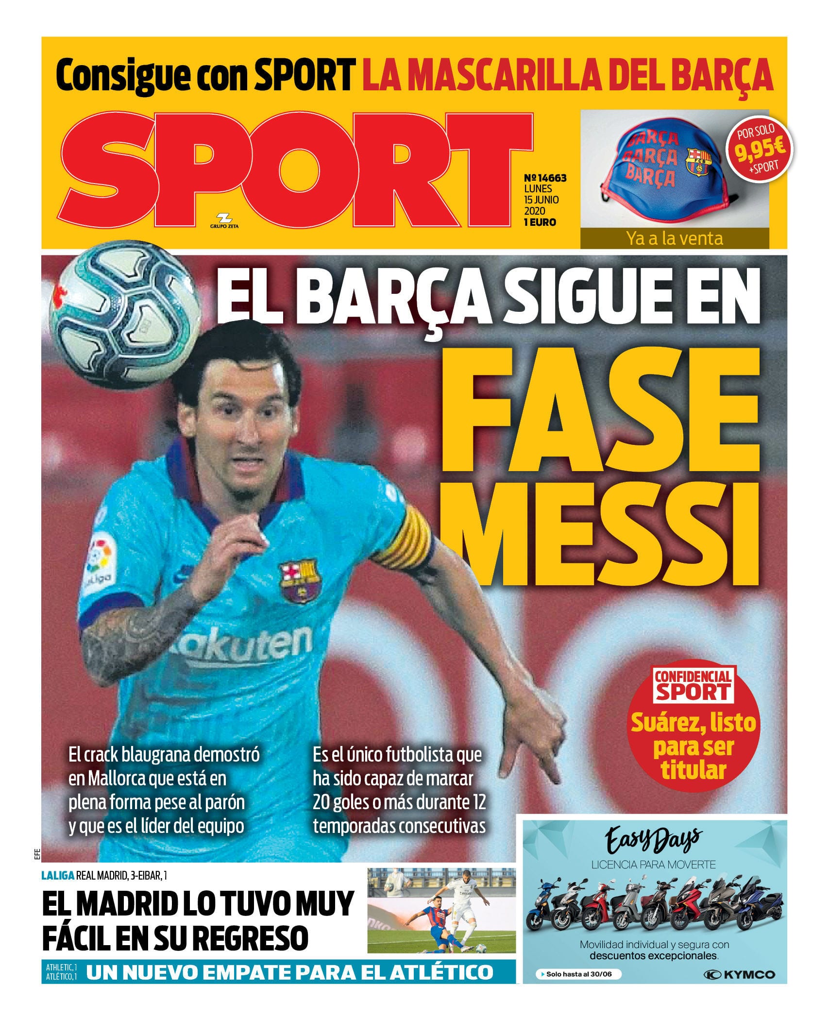 Sport, por su parte, personaliza en Messi el buen debut culé en esta reanudación del campeonato, pero coincide con su vecino culé en anunciar de manera destacada la venta de mascarillas para alivio no de la lucha contra el Covid, sino de la lacerante situación financiera de la entidad blaugrana. La solidaridad ya, si eso, la dejamos para otro día.