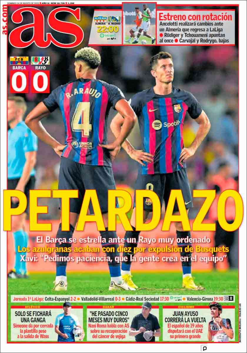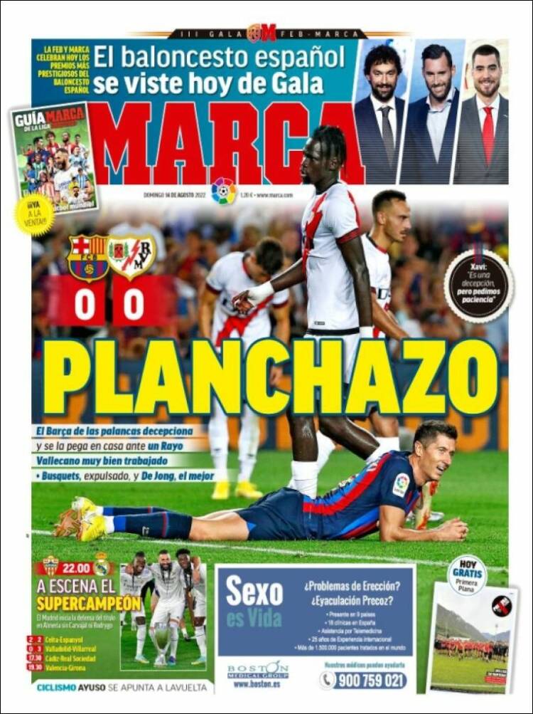 Buenos días, amics, para quien los tenga. Vienen negras hoy nuestras queridas portadas deportivas, y no es para menos. El palanquismo prometía otro comienzo. El palanquismo merecía mayor fortuna. El palanquismo, ese castillo de arena (en el aire) inventado este verano para tranquilidad y disfrute de los niños del mundo, fue apenas una sombra conocida en su debut liguero frente al Rayo. Empate a cero y gracias. Qué bajón, qué apalancamiento.