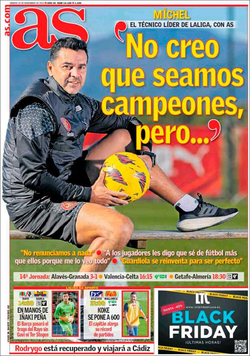 Cruzamos de acera y asimos el As. Más central lechera aún. Portada para Míchel, el entrenador del Girona, el equipo mascota del City. Los madridistas no podemos nada más que dar las gracias al diario As por esta maravillosa primera plana del club favorito de merengues tan ilustres como Puigdemont, o el segundo equipo en preferencias de ese ilustre aficionado del Real Madrid llamado Jaime Robles Lobo, con nombre artístico Jaume Roures.