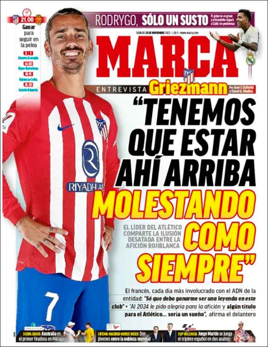 Podemos apreciar que los chicos de Marca solo hablan del Madrid. Ya desde arriba comienzan con las noticias blancas: lo de Rodrygo es solo un susto, no alegramos mucho porque se cuenta que Ancelotti estaba ensayando con Chendo como delantero centro. Todas las demás noticias también tiene al Madrid como protagonista. Abajo, hablan del Ifema Madrid Horse Week, del GP de Valencia, que como sabéis es la playa de Madrid, y de la Copa Davis, cuya final se disputa en Málaga, provincia origen del mito del Real Madrid Juan Gómez Juanito. La imagen central es para un futbolista del Atlético de Madrid. Madrid por todas partes. Ah, y el fondo de la portada es níveo, como la leche que proporciona cada día la central lechera.