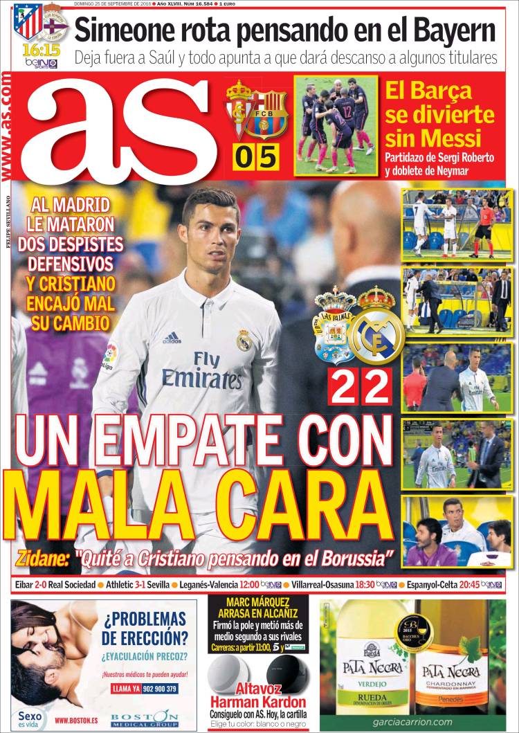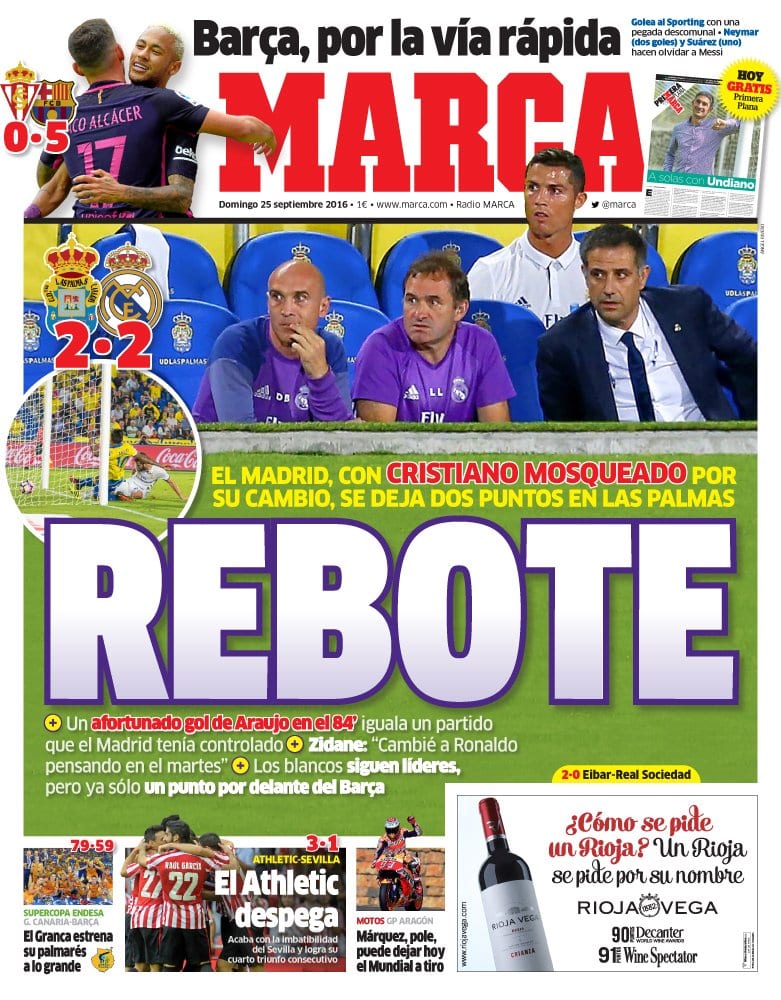 Marca, por su parte, se apunta el juego de palabras con el término "rebote", el metafórico de Cristiano al ser cambiado y el literal que propició el empate de Las Palmas en la única aproximación al área de los canarios en toda la segunda parte. No está mal el intento por parte del diario madrileño, pero nos disculparán si pensamos que no alcanza el tenebrismo que pide la ocasión.