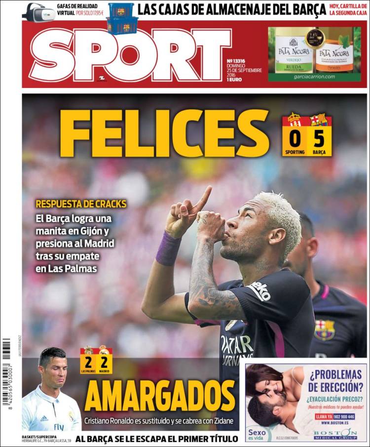 Algún tipo desnortado con más moral que el Alcoyano se atreverá a decir que esa "mala cara" es más que lógica en un jugador como él, que Cristiano se va serio no solo por el hecho insólito de ser cambiado, sino también porque no se halla a sí mismo en este comienzo de temporada. Los más happy del lugar incluso dirán que no querrían ver a un tipo de su nivel yéndose tranquilo y ufano al banquillo, que hasta les gusta ver a Cristiano con gesto adusto por esa autoexigencia que le ha encumbrado. Gente loca hay en todas partes, o lo que es lo mismo, gente que se atreve a ver el vaso medio lleno cuando gracias a Sport sabemos que no es que el vaso esté más vacío que las mencionadas cajas de almacenaje, sino que simple y llanamente no hay ni vaso que ponerse a intentar llenar. La nada más absoluta es lo que hay. "Amargados" y punto. Cerrado por derribo.