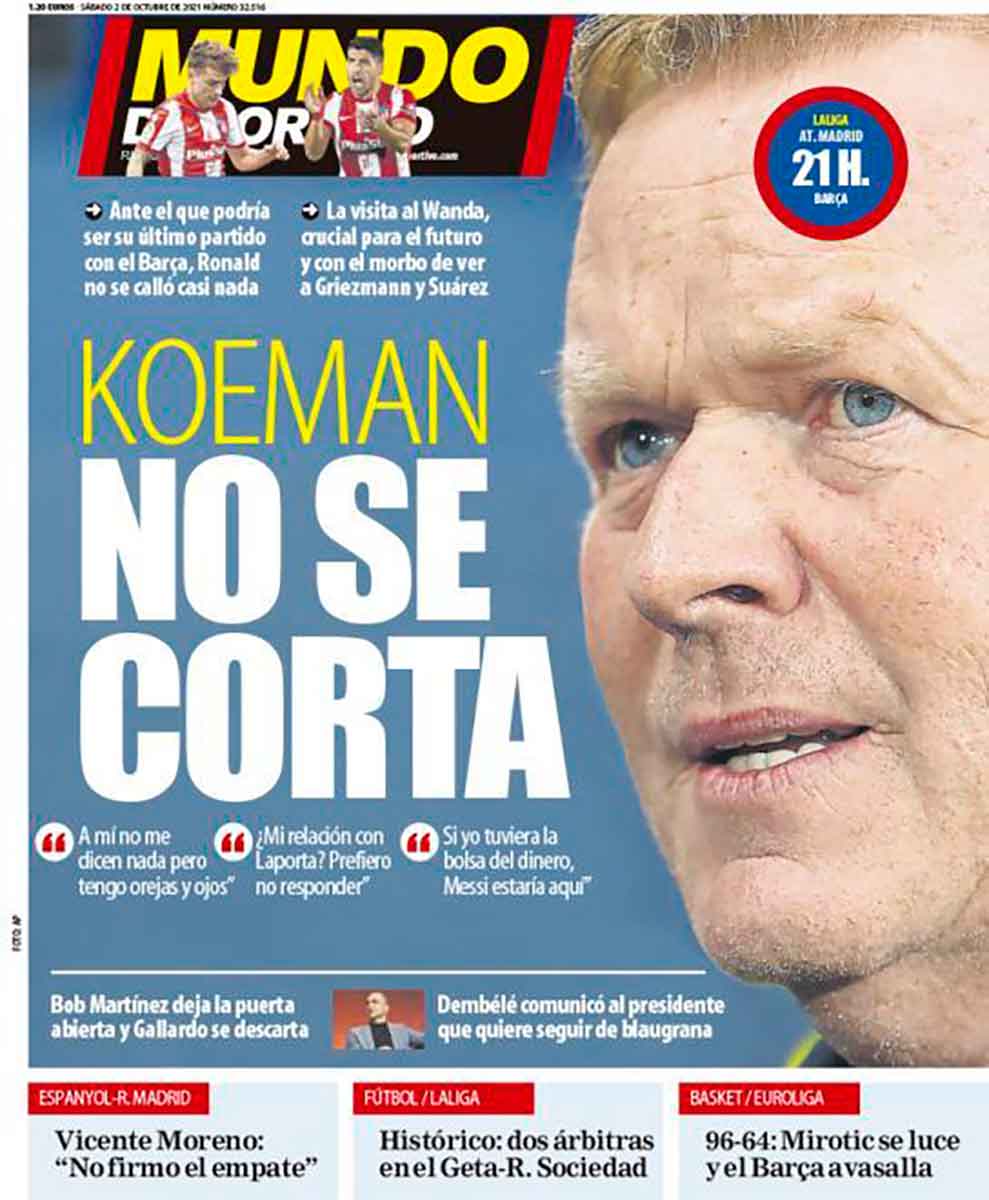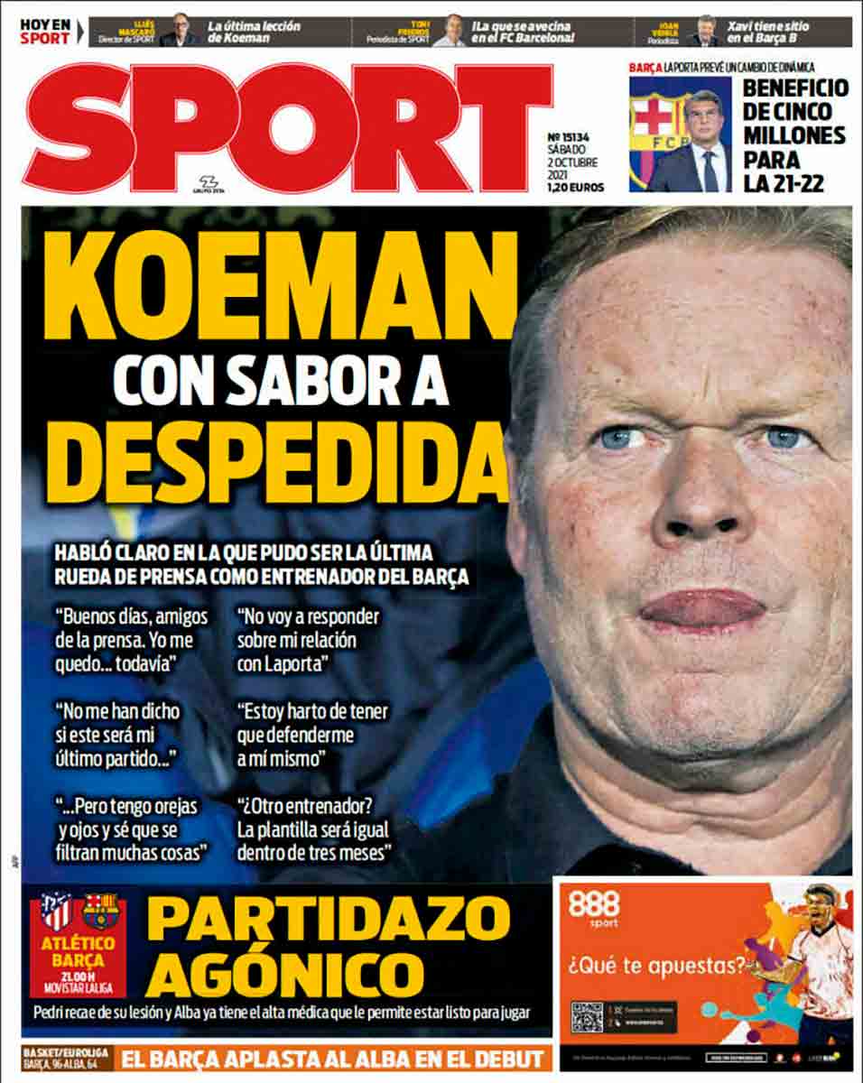 Viendo lo de Marca, tampoco sorprende en exceso el desapego de la portada de Sport respecto de lo que acontecerá en el Wanda Panda esta noche. Lo que ocurre es que por allí arriba a la derecha siguen bajo los efectos de un inmenso shock postraumático y Ronald, su psiquiatra, para echar más leña al fuego, ha decidido quemarse a lo bonzo.