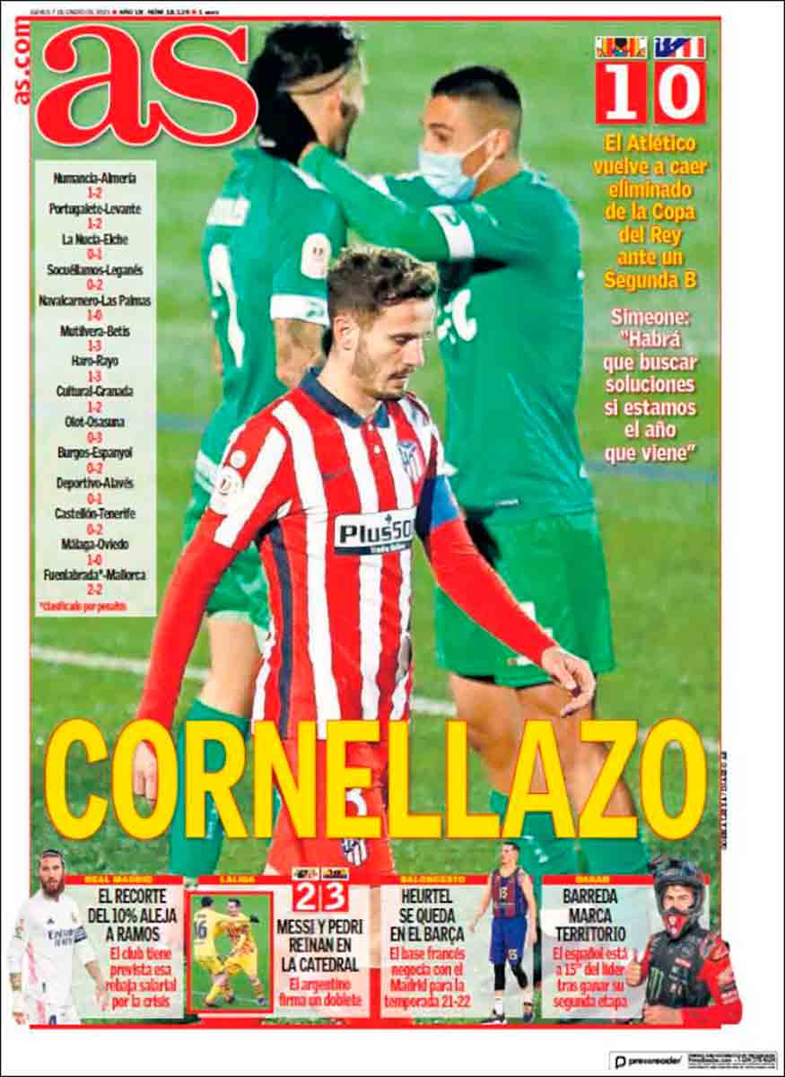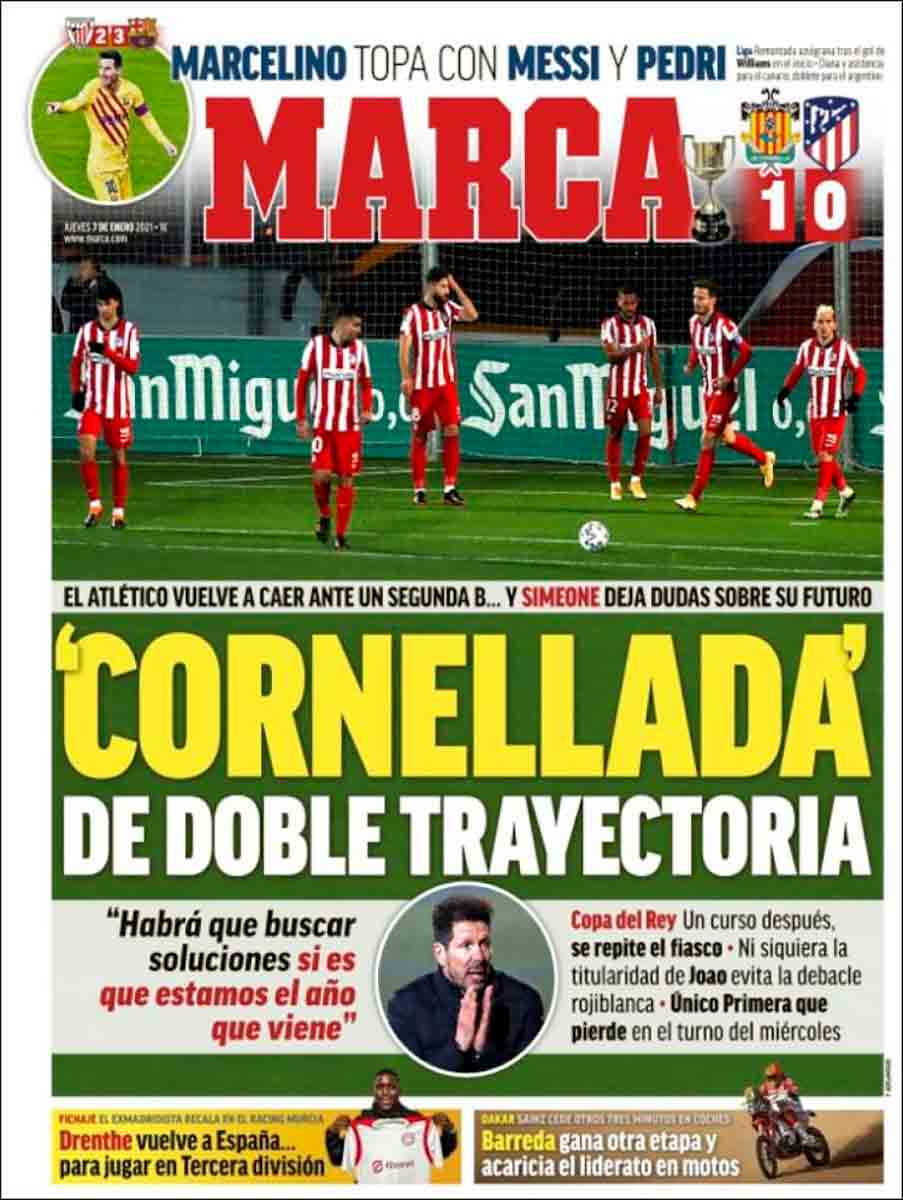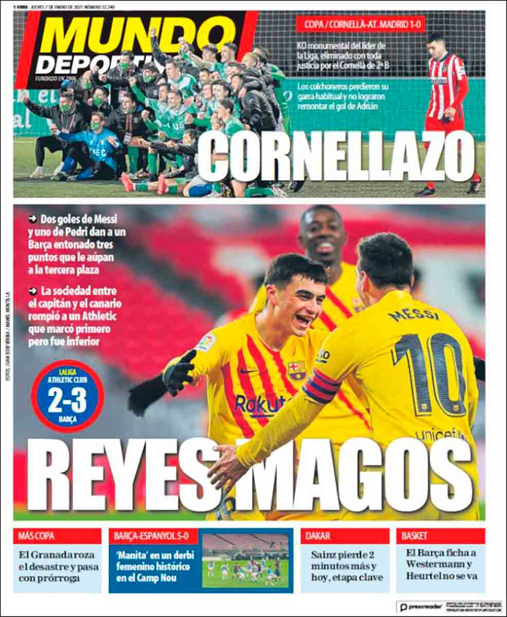 La “cornellada” es reflejada también, con profusión de detalles, por la prensa cataculé, en parte por aquello de que el Cornellà es al fin y al cabo un equipo catalán y se supone (rían con nosotros, aunque hoy menos) que tanto Sport como Mundo Deportivo son capaces de ver más allá del Barça cuando alguna otra cosa deportivamente relevante ha sucedido en Cataluña. El “cornellazo” lo es, evidentemente, aunque el eje central de las primeras planas cataculés se sigue inclinando por lo segundo. Por lo culé. Y es que el FC Barcelona ganó ayer por 2-3 al Athletic, en su partido liguero aplazado. Dos goles, dos postes y buenas sensaciones de Messi, que se entiende muy bien con Pedri. Sport celebra que el Barça “ya” es tercero, a cinco puntos del Madrid y siete de un Atleti con dos partidos menos. Ya son ganas de celebrar, justo cuando ya han pasado las fiestas y se insinúa en el horizonte una de las más empinadas cuestas de enero que recuerda el género humano.