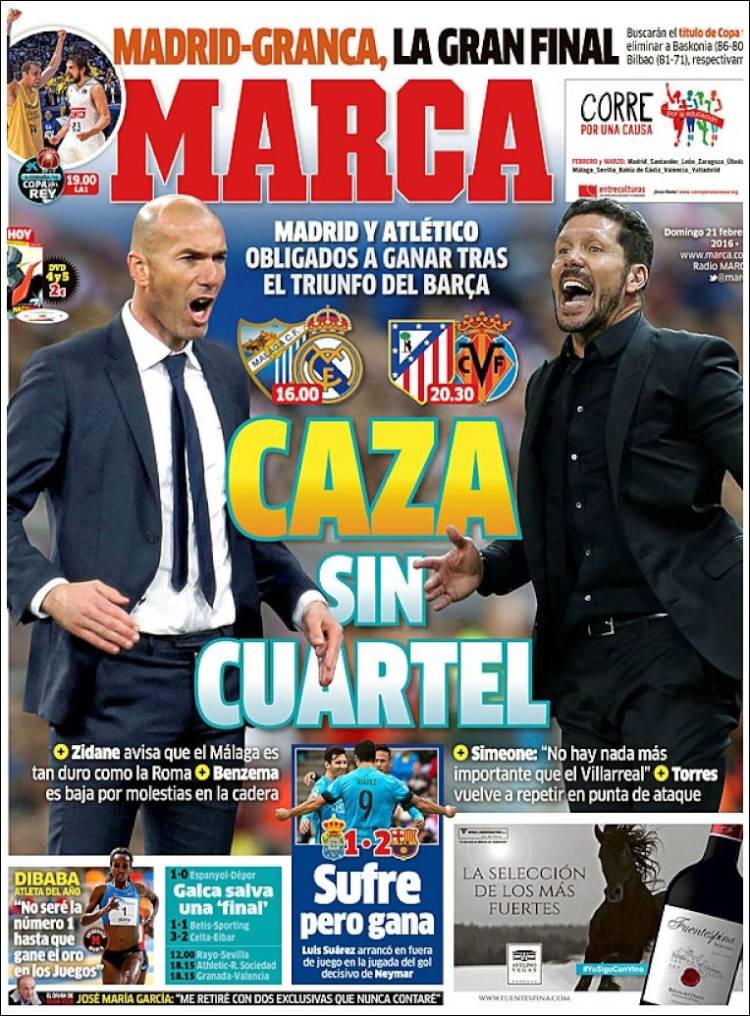 Al margen del bélico titular que aparece hoy en la portada de Marca -ya hablaba Sánchez Ferlosio de las íntimas relaciones existentes entre el fútbol y la guerra-, quedémonos con el antetítulo para glosar la poca gracia de esta comedia: "Madrid y Atlético obligados a ganar tras el triunfo del Barça". En un primer vistazo, se nos antoja incontestable lo expresado y, pese a todo, así queremos que ocurra, como si no estuviera pasando nada entre bambalinas, como si más que una comedia esta Liga fuera puro realismo galdosiano. Así pues, esperamos que el Madrid gane hoy en Málaga y vuelva a ganar cada uno de los partidos que le quedan por delante.