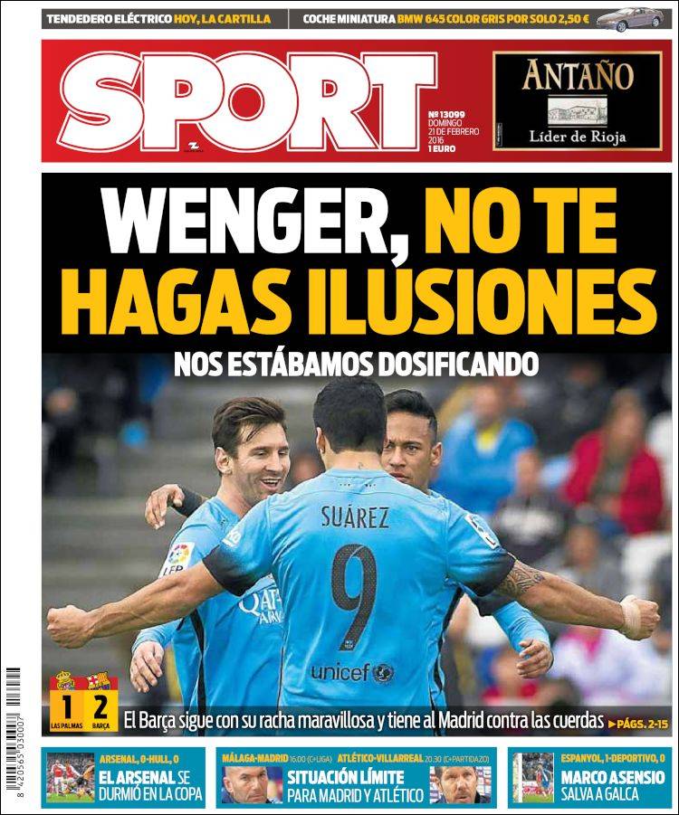 Si tanto Marca como As al menos mencionan el fuera de juego que tanta gracia nos está haciendo, ¿ven alguna referencia al chiste en las portadas catalanas? Qué va. Ellos tienen un humor más refinado, tanto que lo provocan sin querer, a fuerza de un desacomplejado e hipertrofiado forofismo. A nosotros nos hace especial gracia el subtítulo que se saca Sport de la manga: "El Barça sigue con su racha maravillosa y tiene al Madrid contra las cuerdas". Dando por sentado que el Atlético no cuenta para el entorno culé -o lo que es lo mismo, que ellos viven para estar en contra del Madrid: qué pobre espíritu-, no descartemos que con "racha maravillosa" ya no hablen de victorias o de juego (de juego no podría ser si no son ciegos), sino precisamente de la cantidad de beneficiosos errores arbitrales y de casi tan beneficiosos pies de puntillas de la prensa deportiva sobre tales errores. Todo ello da como resultado la madre de todas las victorias, la de que todo sea una balsa de aceite para los culés aunque la balsa haga aguas por varios sitios, desde los juzgados hasta el terreno de juego, desde el padre de Neymar hasta Bartomeu.