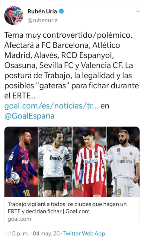 ¿Lo ven? ¿No? Observen la fotografía de la derecha. Es Benzema. ¿No les amenaza el vahído? Benzema es jugador del Real Madrid. El Real Madrid NO ha realizado un ERTE. Barcelona, Atlético de Madrid, Alavés, Espanyol, Osasuna, Sevilla y Valencia, sí. ¿Todos? No. Osasuna tampoco se ha acogido a ningún ERTE. Se lo advierte al artista un admirador. El genio lo comprueba, da las gracias y rectifica públicamente.