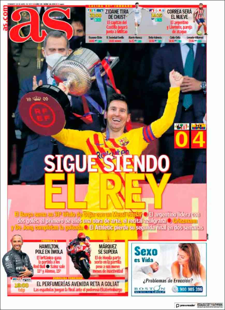 En todo caso, la prensa mesetaria se muestra, sin duda alguna, más mesetaria que nunca en sus portadas, arrinconando las referencias al partido que disputa hoy el Real Madrid en Getafe en el lugar de honor que merece lo blanco en aún más plena coherencia con el centralismo más centralista de todo centralismo, esto es, arriba a la derecha. No merecemos más. El Barcelona es Rey de Copas y eso hay que celebrarlo, aunque la sonrisa de Messi dé también para asustar a los niños del mundo, que seguirán siendos culés pese a la inquietante estampa.