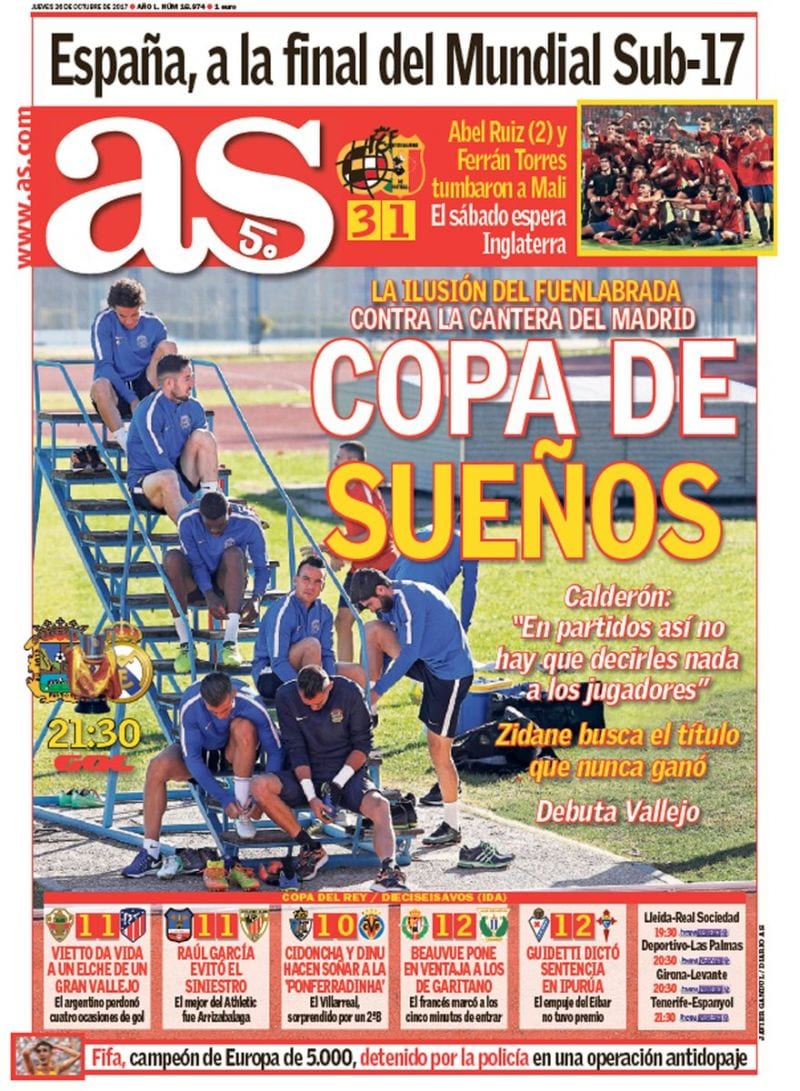 La Copa induce al romanticismo, a la épica, al alcorconazo, e incluso a la horterada que ha titulado Ouija Today en su portada. “Copa de sueños” y sueño precisamente produce esta mañana Relaño en su editorial metafísico sobre Fuenlabrada y las bondades del fútbol modesto. Será interesante comprobar cómo se desenvuelve el Madrid esta noche en un estadio lleno de malos espíritus y escopetas de feria. No en vano el coliseo se llama Fernando Torres pero no podemos confirmar que el campo tenga a su vez mechas rubias.