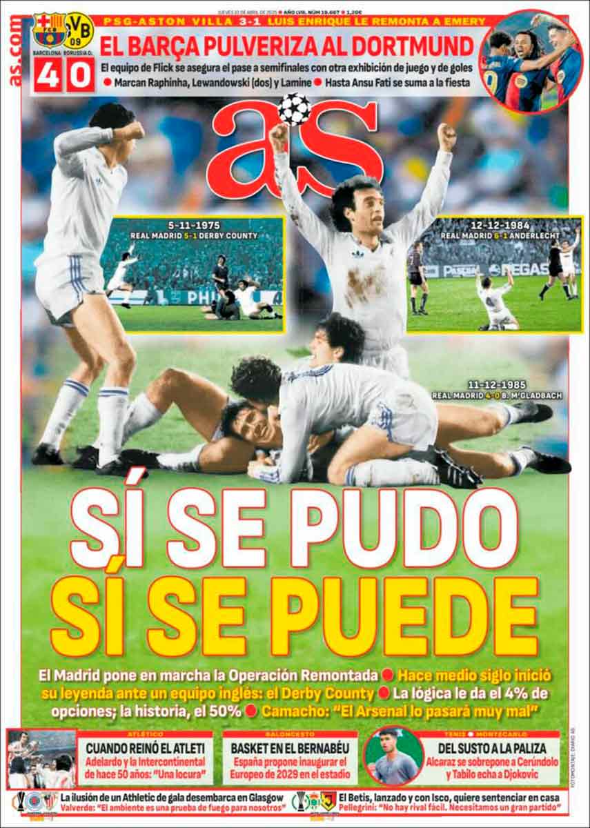 La prensa madrileña habitualmente se caracteriza por su antimadridismo. Hoy descolla en este aspecto As. Contraviniendo a X Real Madrid, titula «Sí se pudo. Sí se puede», en referencia a una remontada contra el Arsenal. Para ello, se basa en argumentos tan absurdos como que ya se ha remontado en otras ocasiones y que según la historia hay un 50 % de probabilidades (frente a un 4 % de la lógica). Contraponer la historia de un club frente a la ciencia verdadera de un puñado de tuiteros es de una insensatez intolerable, As.