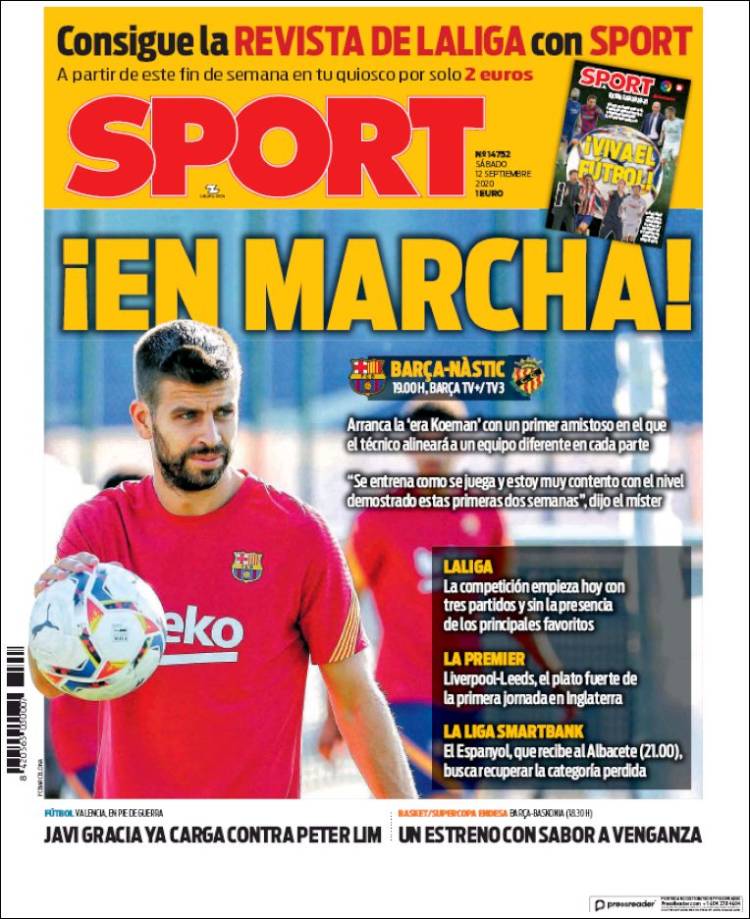 Buenos días. Aun yendo en su busca, nos hemos topado con la portada de Sport y hemos creído que era la portada de Teleprograma (TP). ¿Recuerdan aquella revista de los noventa sobre la programación televisiva del tamaño de un DVD? Por un segundo Sport nos ha parecido el TP y Piqué Leticia Sabater presentando ¡Mucha Marcha! Pero no era ¡Mucha Marcha! sino ¡EN MARCHA! Qué susto.