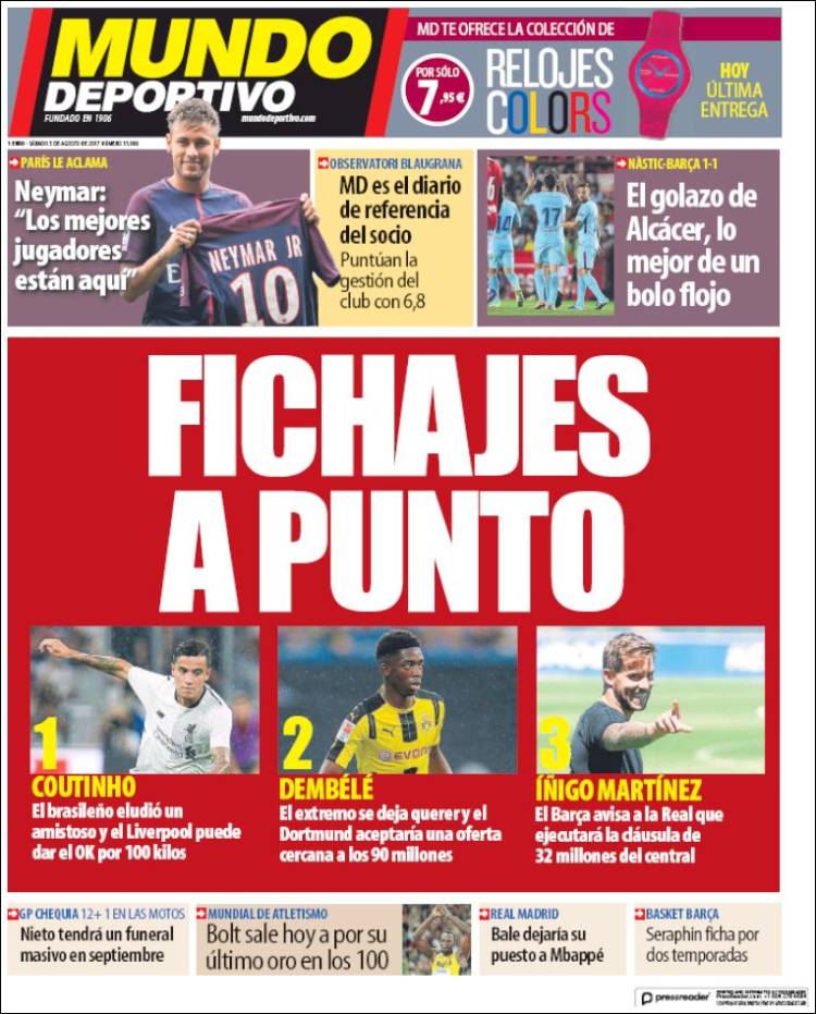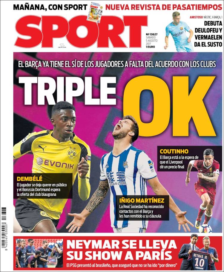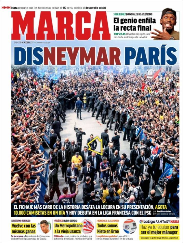 Sólo en Marca verán una portada dedicada al asunto acorde con el alcance la noticia y la envergadura del dato: el fichaje más caro de la historia (otra vez) con Neymar y su papá bailando un can can en el Moulin Rouge. Sus competidores, As, MD y Sport, prefieren dedicar el grueso de sus primeras planas a otras asuntos en un ejercicio de irresponsabilidad periodística habitual pero no por ello menos sorprendente.