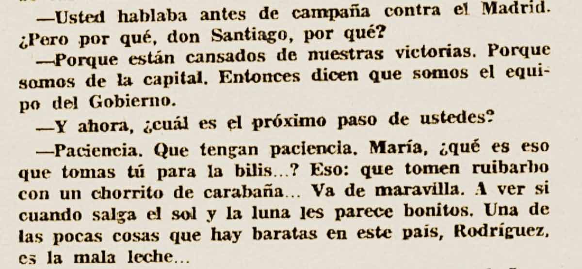 El día que se cumplen 46 años de su fallecimiento, viene a cuento recordar las palabras de don Santiago Bernabéu —rescatadas por Alberto Cosín en Twitter— sobre el tratamiento óptimo para aquellos aquejados de bilis, como es el caso del tal Iván: «Paciencia. Que tengan paciencia. María, ¿qué es eso que tomas tú para la bilis…? Eso: que tomen ruibarbo con un chorrito de carabaña… Va de maravilla. A ver si cuando salga el sol y la luna les parecen bonitos. Una de las pocas cosas que hay baratas en este país, Rodríguez, es la mala leche…».